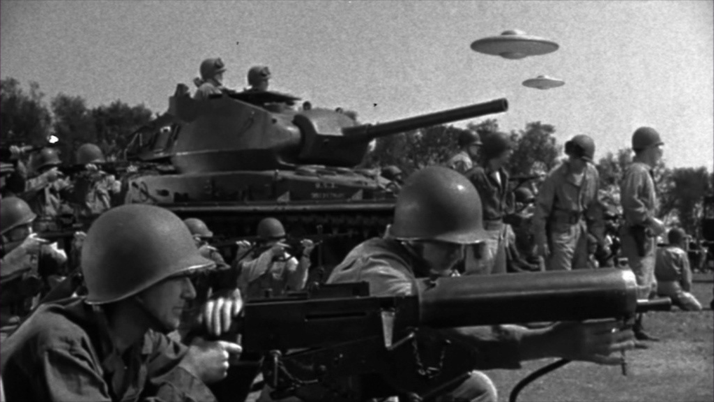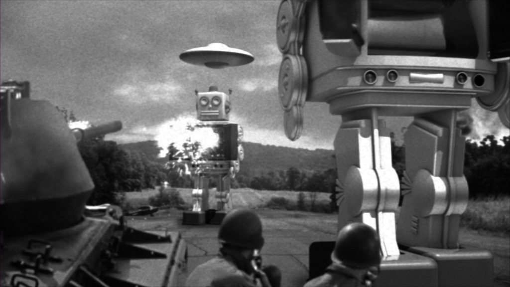 The Robots, UFO's and crop fields were all produced in Cinema 4D and then composited using After Effects. Actual explosions and smoke textures we then layered to add a bit of realism to the piece, although I deliberately wanted it to look a bit rubbish... like the movies of that era! I was almost tempted to add wires back into the top of the UFOs.