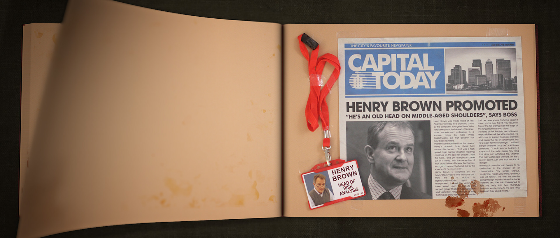 Created in Cinema 4D from page artwork supplied by the films art department. Extra dirt, and marmalade were added in photoshop and additional page content animations created in After Effects. The final render was used as a background for the roller titles to sit in on the left in the blank page area.
